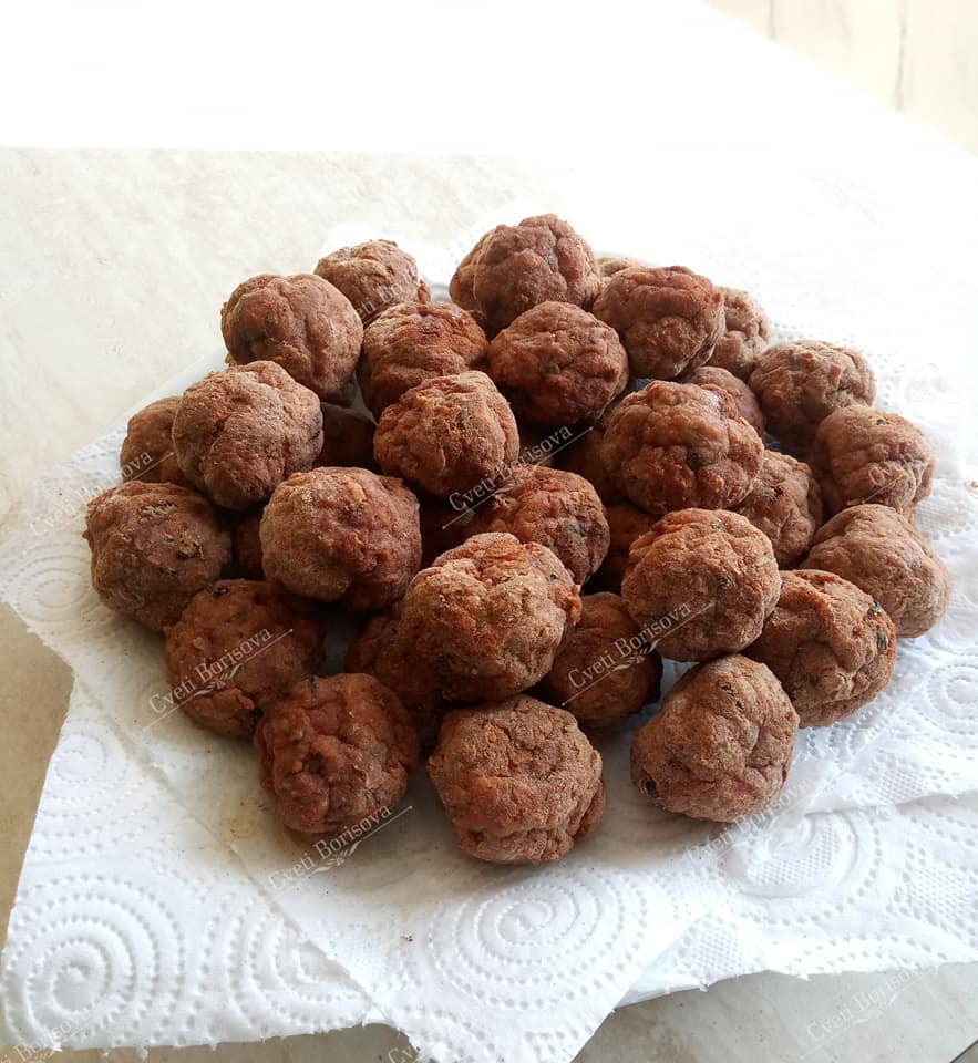 Ζυμώνουμε τον κιμά και σχηματίζουμε μικρά στρογγυλά κεφτεδάκια, τα τυλίγουμε σε αλεύρι και τα τηγανίζουμε σε περισσότερο λάδι.