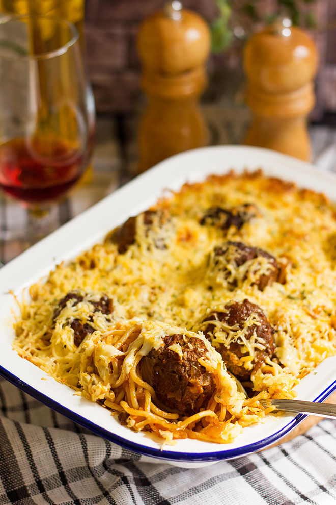 Σε ένα πυρέξ, προσθέστε τα ζυμαρικά και στη συνέχεια τη σάλτσα με τα κεφτεδάκια και ανακατέψτε