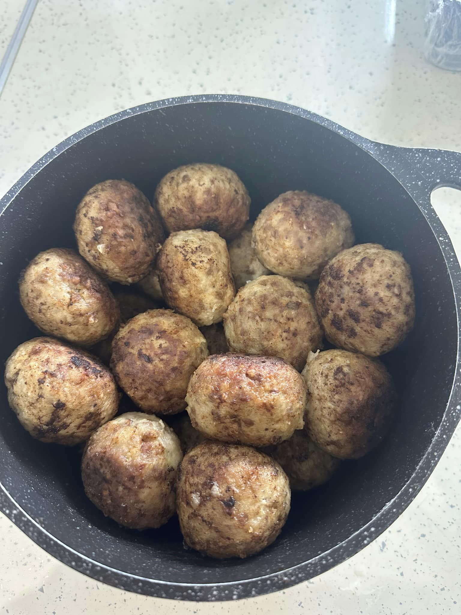 Ανακατεύουμε τα πάντα και ζυμώνουμε καλά για 5-7 λεπτά. Βρέχουμε τα χέρια μας σε νερό και σχηματίζουμε κεφτεδάκια (έχω 70 γρ. το καθένα). Ρίχνουμε λάδι στο τηγάνι, το ζεσταίνουμε καλά.