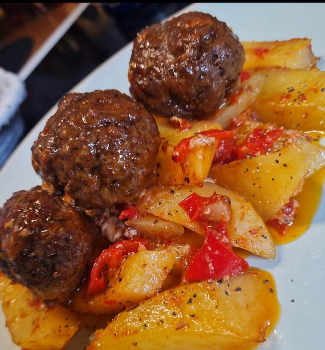 Αφαιρέστε το αλουμινόχαρτο και ψήστε για άλλα 30 λεπτά, μέχρι να ροδίσουν τα κεφτεδάκια και να ψηθούν οι πατάτες.