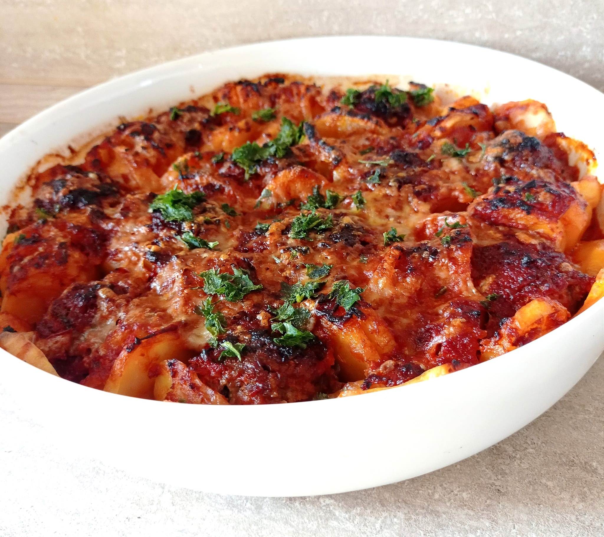 και περιχυμένες με μια αυτοσχέδια σάλτσα σπιτική ντομάτας . Ξαναβάζω το ταψί στο φούρνο για περίπου 30 λεπτά μέχρι να κοκκινίσει από πάνω. Μετά αποφάσισα να προσθέσω λίγο κίτρινο τυρί και να ψήσω για άλλα 5-10 λεπτά μέχρι να λιώσει.