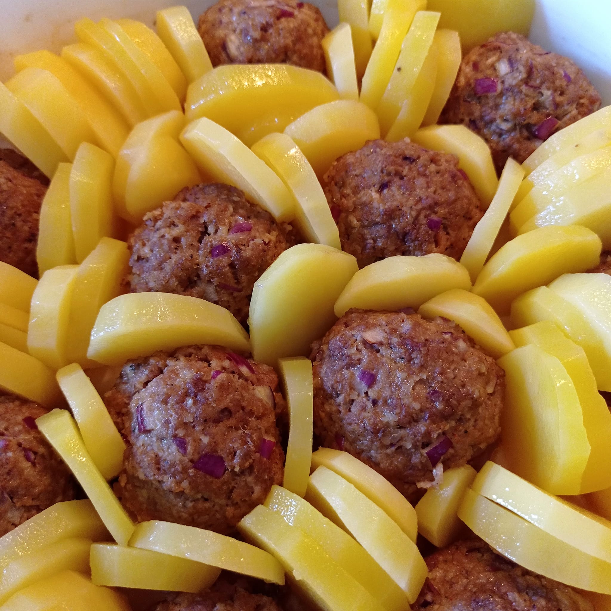 Μετά τα έβγαλα τα κεφτεδάκια από το φούρνο και στρώνω γύρω τους τις πατάτες αλατισμένες