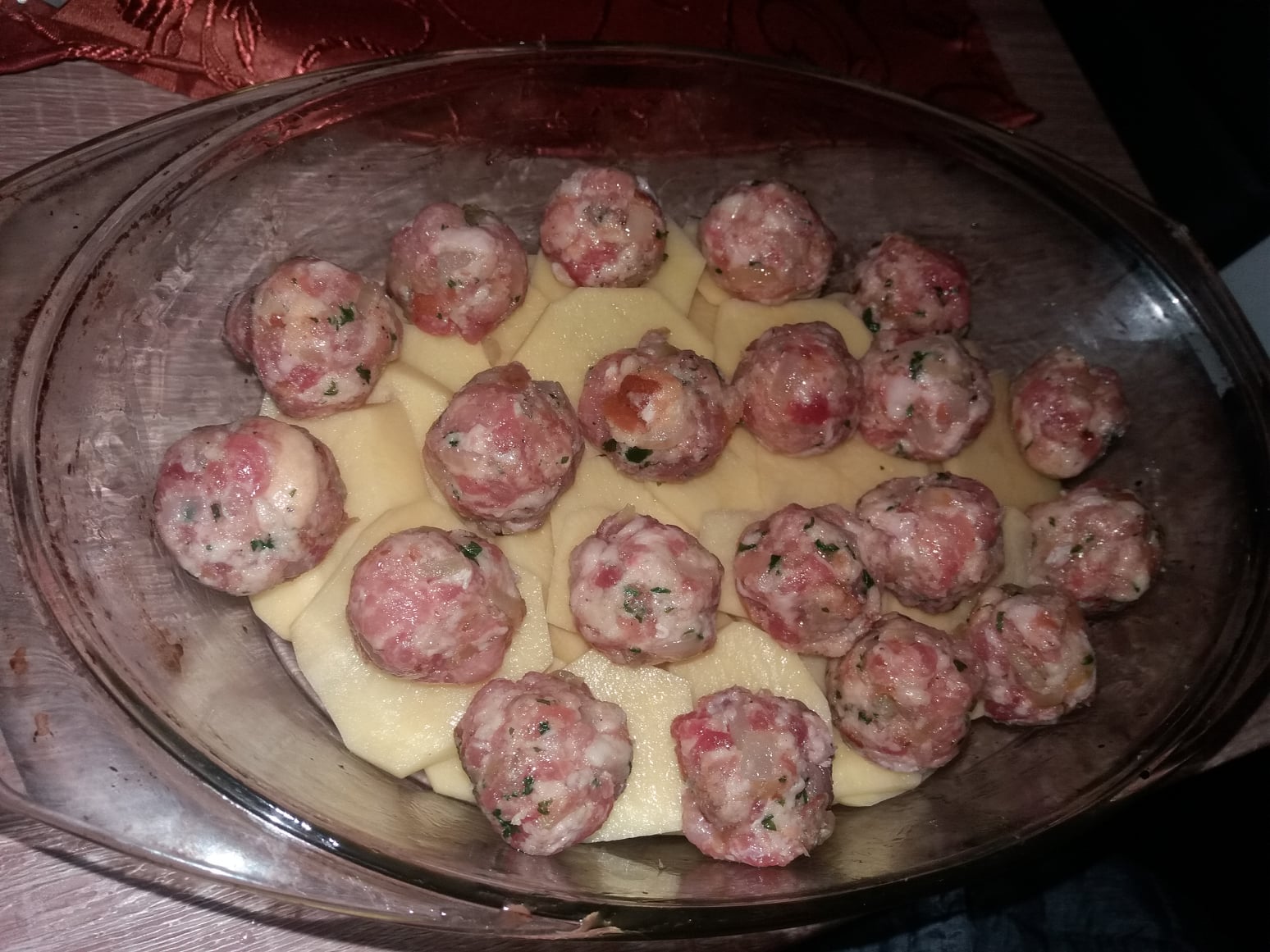 Αλείφουμε με λάδι ένα πυρεξ, βάζουμε τις φέτες πατάτας και από πάνω προσθέτουμε τα κεφτεδάκια,