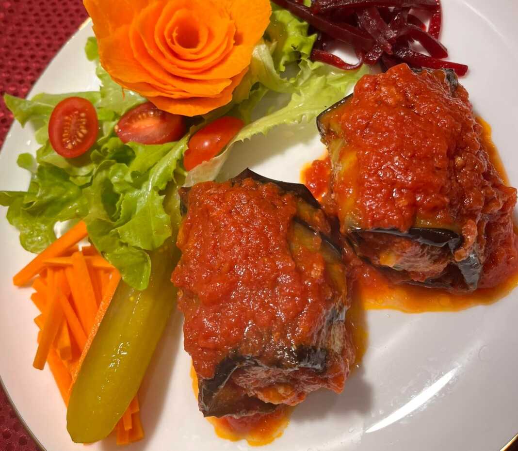 Κεφτεδάκια φωλιασμένα σε μελιτζάνα και πνιγμένα σε σάλτσα ντομάτας