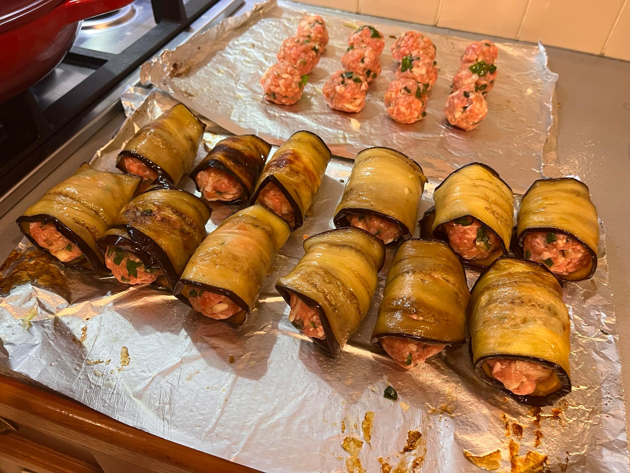 Πλάθουμε μικρά κεφτεδάκια και τυλίγουμε το κάθε ένα σε μια λωρίδα μελιτζάνας.