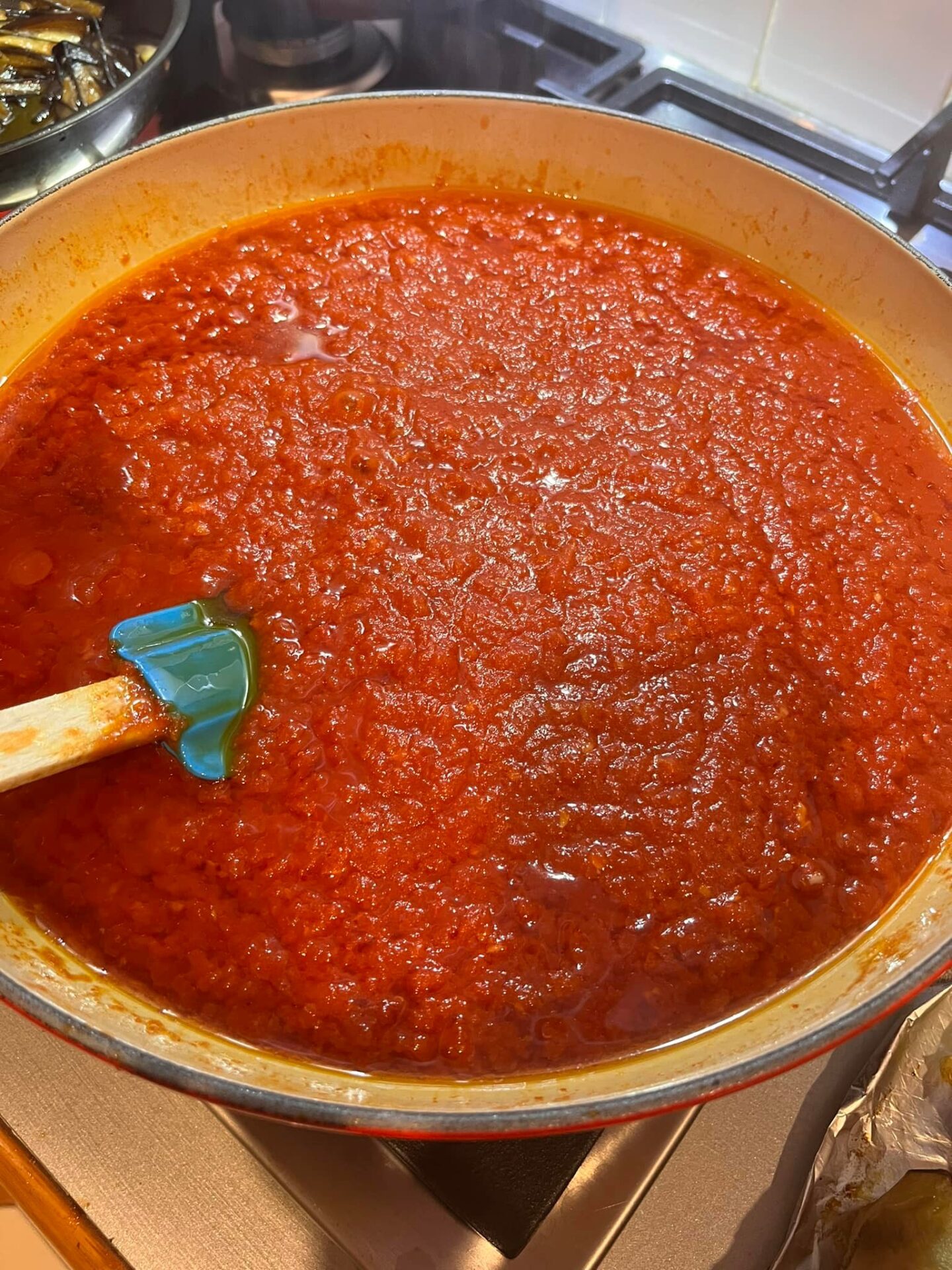 Για την σάλτσα, σοτάρουμε για λίγο στο λάδι το σκόρδο και το πετάμε. Προσθέτουμε τα υπόλοιπα υλικά και βράζουμε για 10-15 λεπτά. Αφήνουμε την σάλτσα να κρυώσει λίγο.