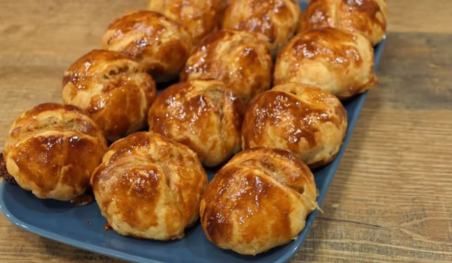 Από τον κιμά σχηματίζουμε μικρά κεφτεδάκια, τα οποία τοποθετούμε στα τετράγωνα της ζύμης. Μαζεύουμε τις άκρες της ζύμης και σχηματίζουμε μια μπάλα.