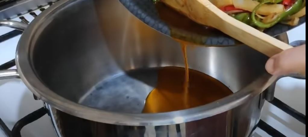 Αδειάζουμε τους χυμούς από το τηγάνι σε μια κατσαρόλα