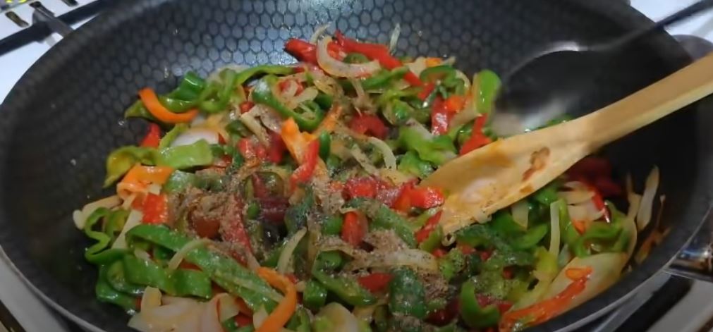 Ρίχνουμε μέσα τα κρεμμύδια στο τηγάνι και τα σοτάρουμε, προσθέτουμε τις πιπεριές και τις