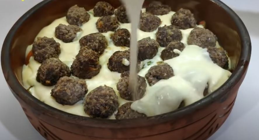 από πάνω την μισή μπεσαμέλ και από πάνω τα κεφτεδάκια και μετα την υπόλοιπη μπεσαμέλ.