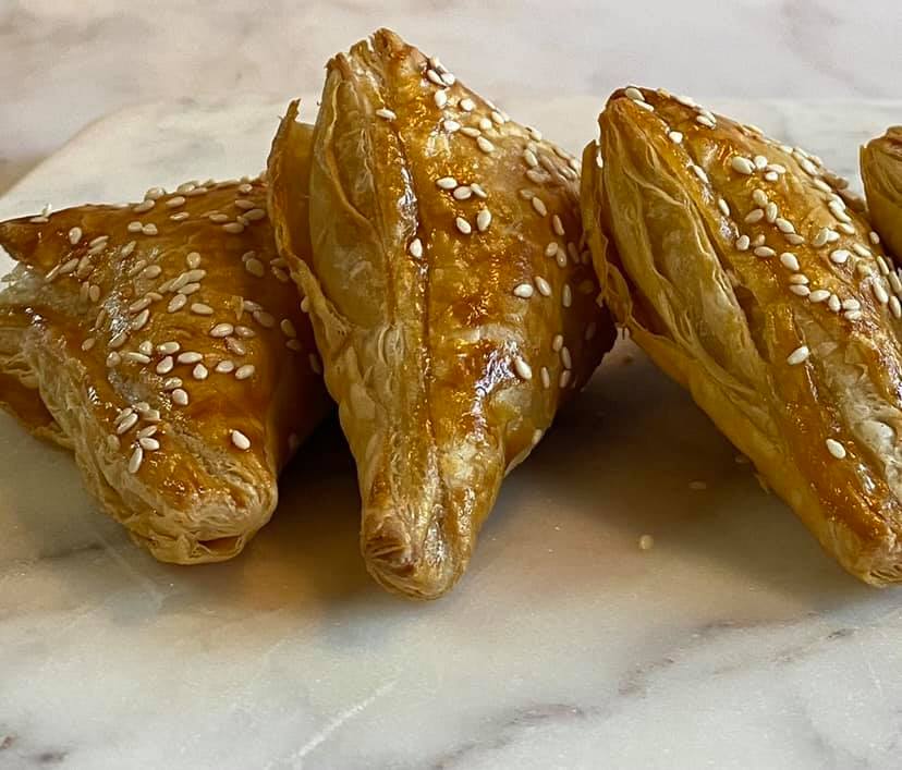 Τοποθετήστε σε ταψί στρωμένο με χαρτί ψησίματος, αλείψτε με αυγό και πασπαλίστε με σουσάμι.
