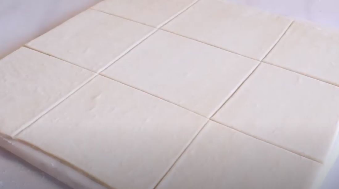 Αλευρώστε και ανοίξτε τη ζύμη σε πάχος 3 mm, κάντε τετράγωνα,