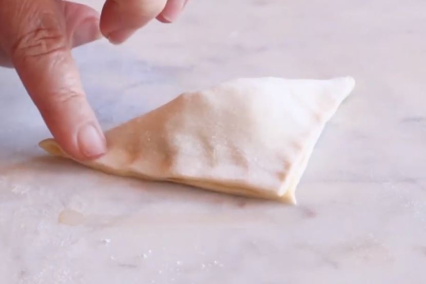 τοποθετήστε το γέμισμα στο μισό τρίγωνο και καλύψτε την άλλη πλευρά. Πατήστε τις ραφές για να κλείσετε.