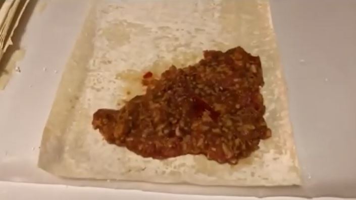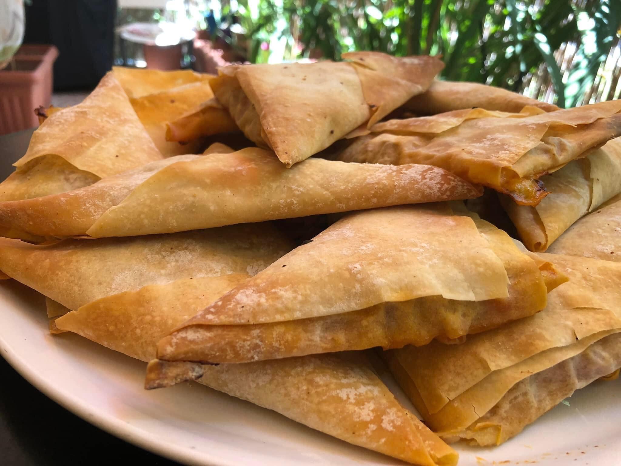 Σε ένα μεγάλο μπολ ανακατεύουμε πολύ καλά όλα τα υλικά και τα αφήνουμε στην άκρη στο ψυγείο μέχρι να ομογενοποιηθούν. Πάνω στο φύλλο μας, τοποθετούμε την επιθυμητή ποσότητα γέμισης και σχηματίζουμε μια τρίγωνη πίτα,