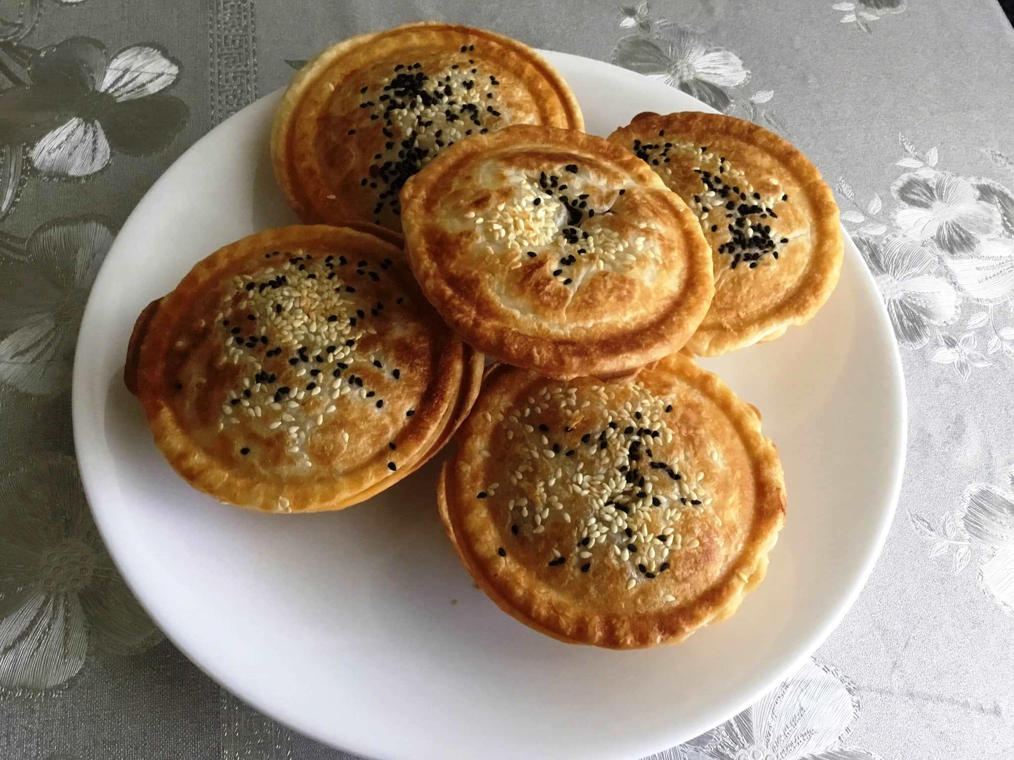 Αλείψτε τις κορυφές με αυγό. Χρησιμοποιώντας ένα μικρό κοφτερό μαχαίρι, κόψτε ένα μικρό άνοιγμα ατμού πάνω από κάθε πίτα και πασπαλήστε με σουσάμι