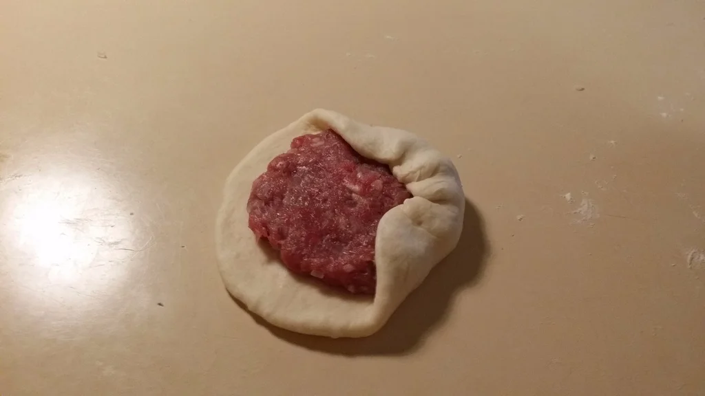 Τοποθετούμε μια μπάλα κιμά στη μέση του κύκλου και ισιώνουμε το κρέας σε ένα μπουρέκι.