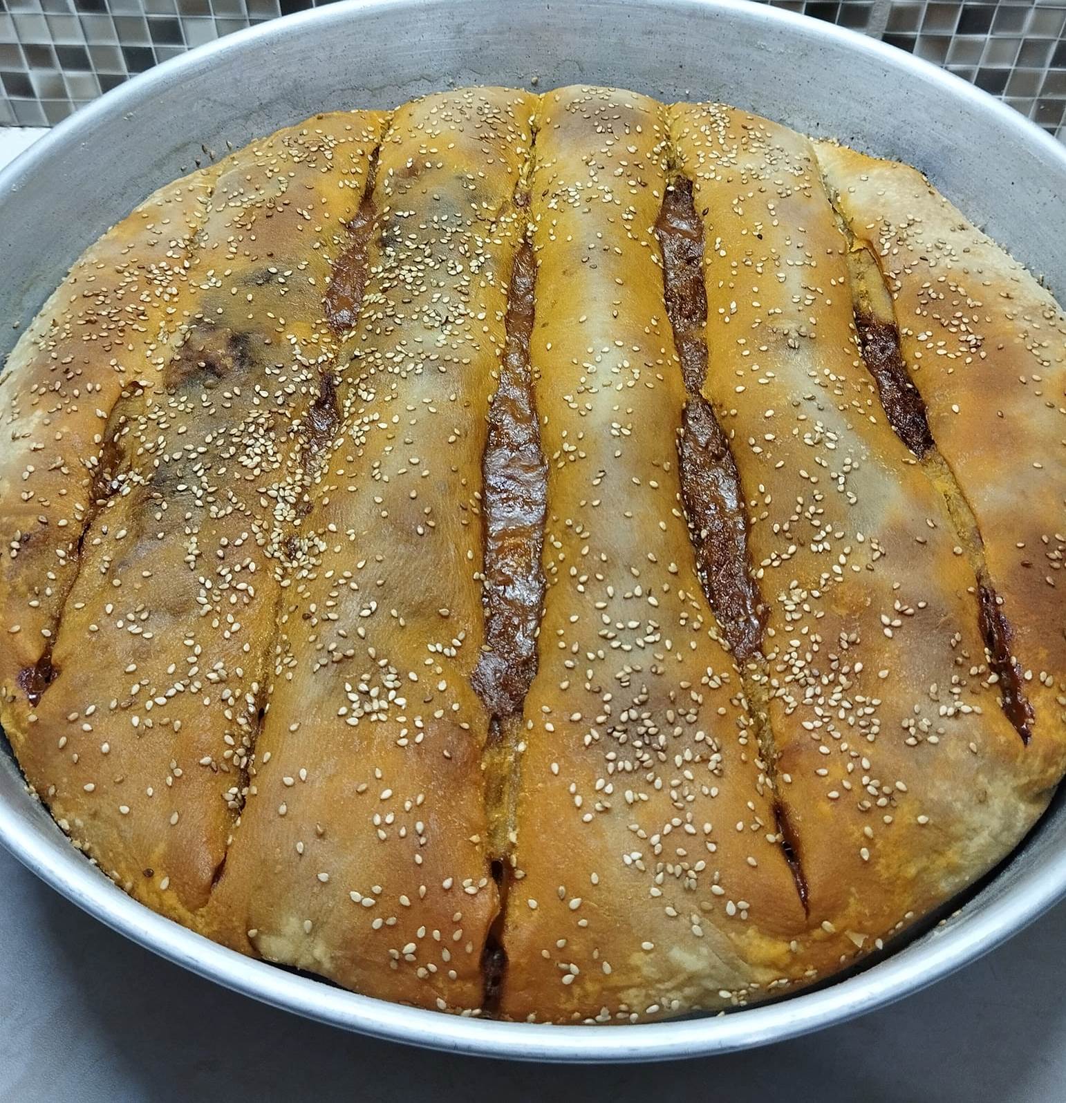Λαδώνουμε καλά την επιφάνεια της πίτας, ραντίζουμε με λίγο νερό και πασπαλίζουμε με σουσάμι.