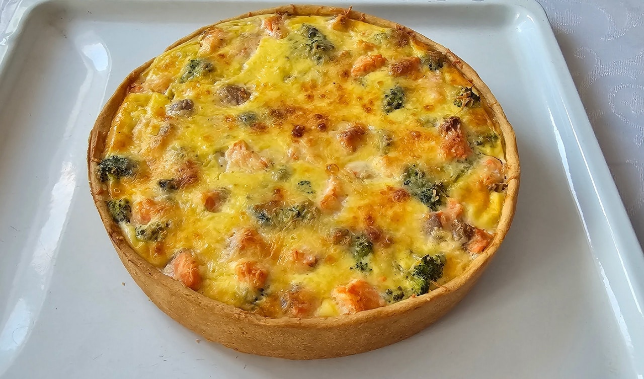 Γεμίζουμε το κις: Απλώνουμε στη βάση το μισό ψάρι, το μισό τυρί, το μπρόκολο, το υπόλοιπο ψάρι και σχεδόν όλο το υπόλοιπο τυρί (κρατάμε λίγο για το γαρνίρισμα). Ρίχνουμε την επικάλυψη ομοιόμορφα. Πασπαλίζουμε με το υπόλοιπο τυρί.