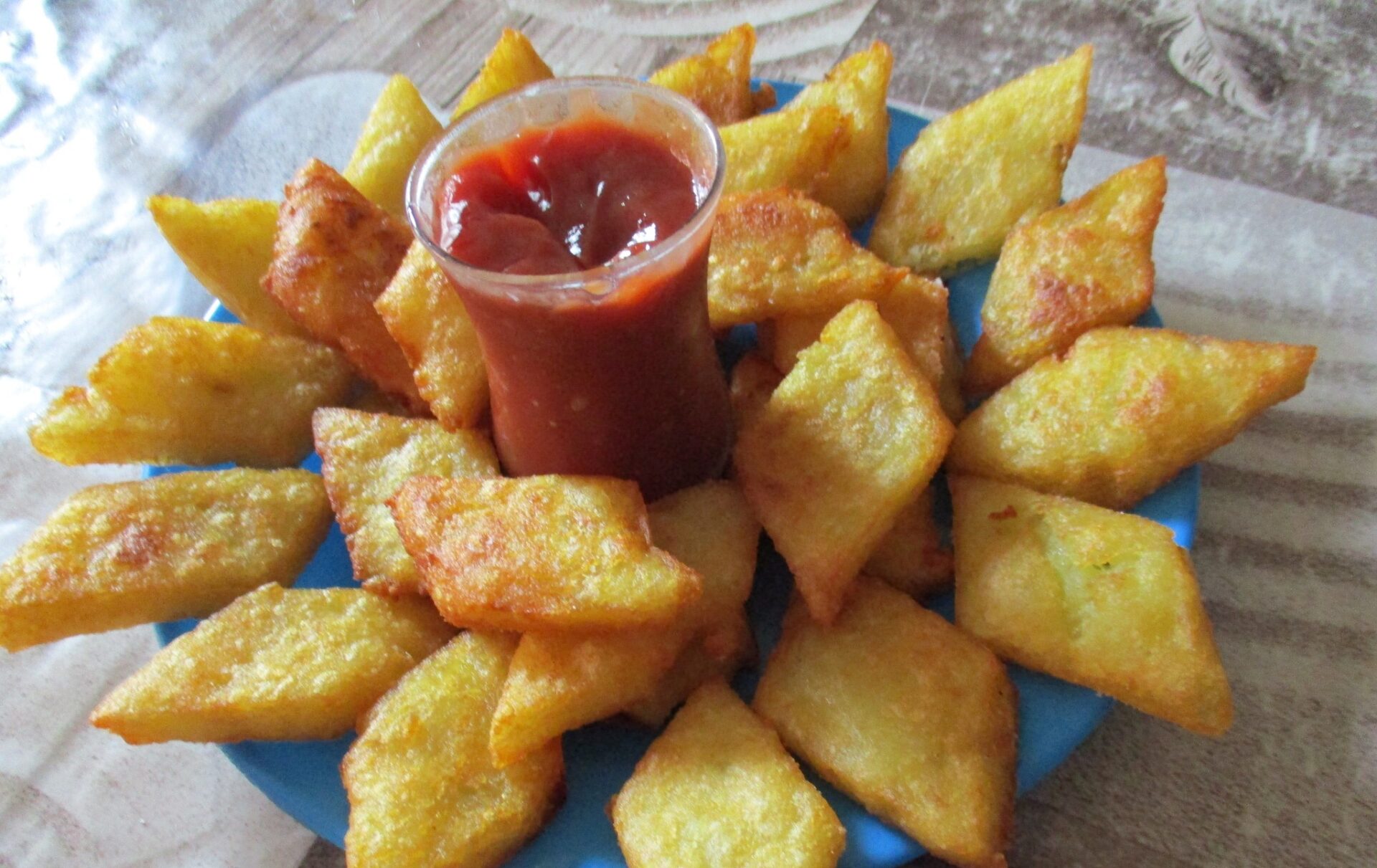 Ζυμώνουμε τη ζύμη και την ανοίγουμε σε ορθογώνια κρούστα. Κόβουμε σε ρομβοειδή σχήματα και τηγανίζουμε σε καυτό λάδι.