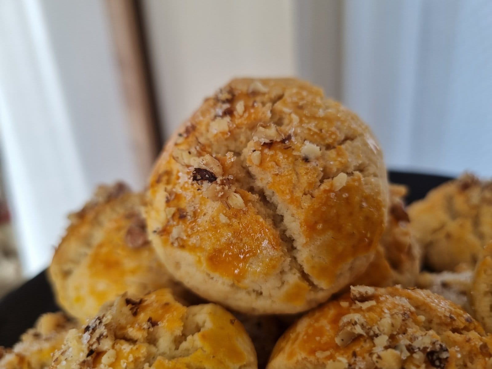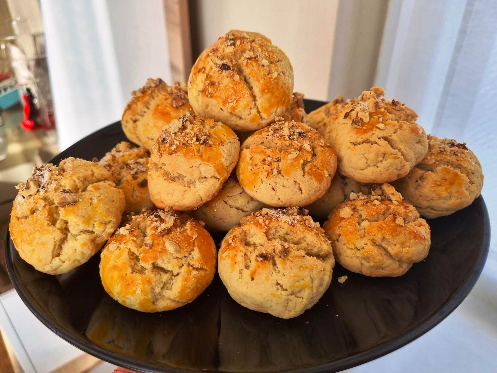Σε ένα ταψί φούρνου στρώνουμε μια λαδόκολλά παίρνουμε δόσεις 25-30 γρ και φτιάχνουμε μπαλάκια στο ταψί και τα αλείφουμε με ένα χτυπημένο κρόκο και πασπαλίζουμε με τριμμένο καρύδι.