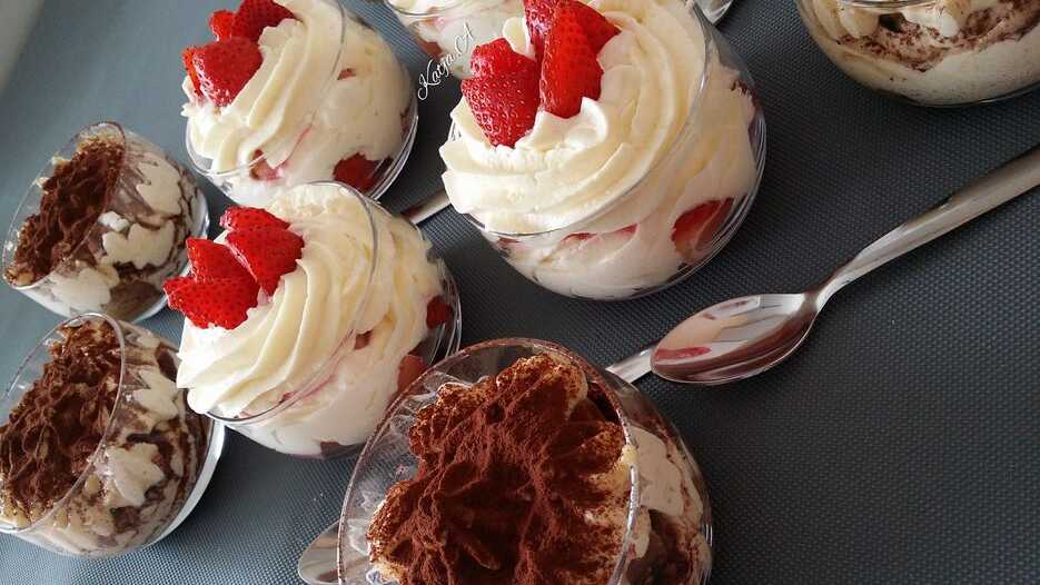 Στον πάτο των φλιτζανιών βάλτε μια στρώση από σαβαγιαρ, ελαφρώς εμποτισμένες με το σιρόπι, συν μερικά κομμάτια φράουλες.