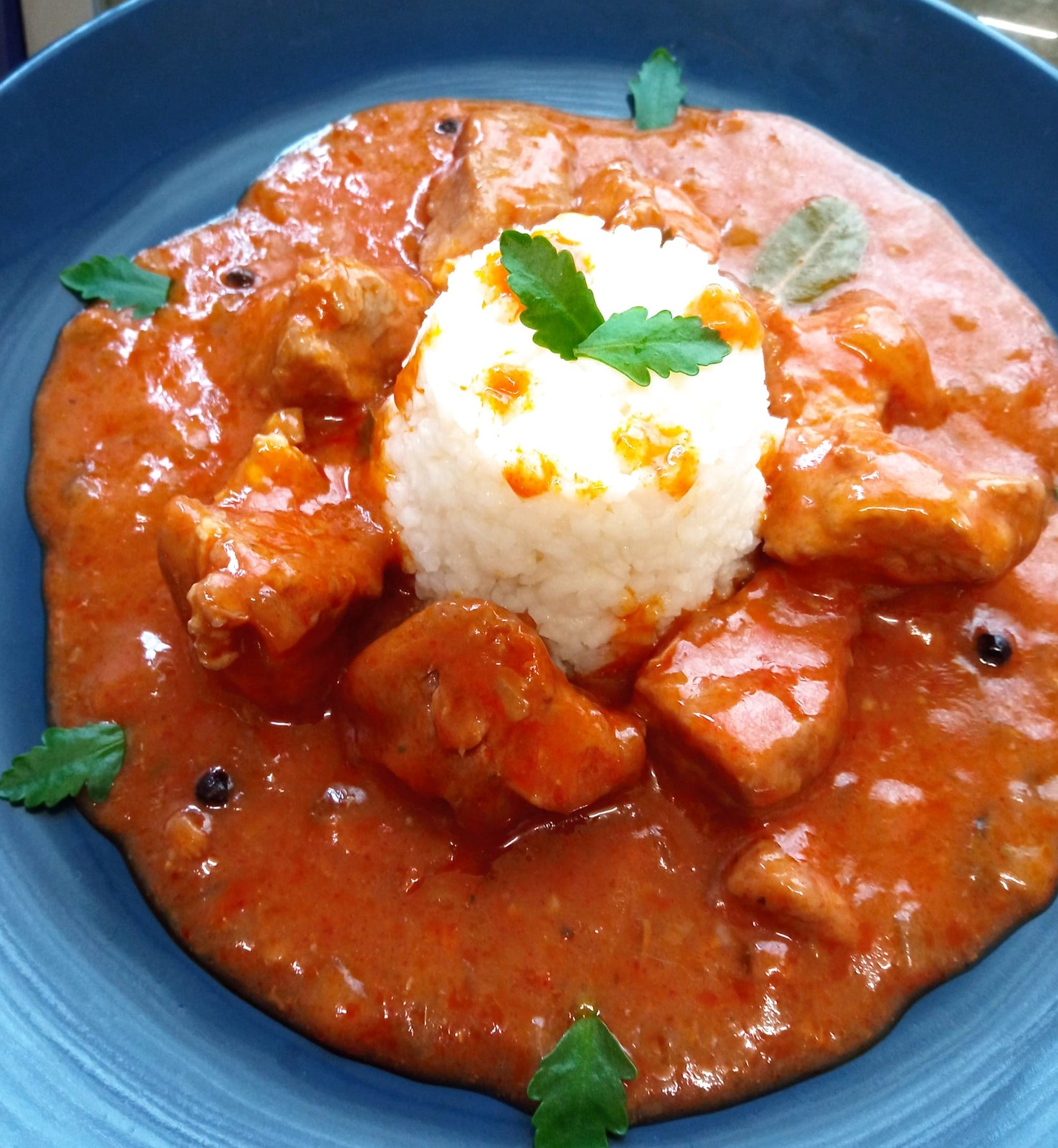 Σερβίρουμε με βρασμένο λευκό ρύζι, το οποίο έχουμε μαγειρέψρι και στραγγίσει προηγουμένως.