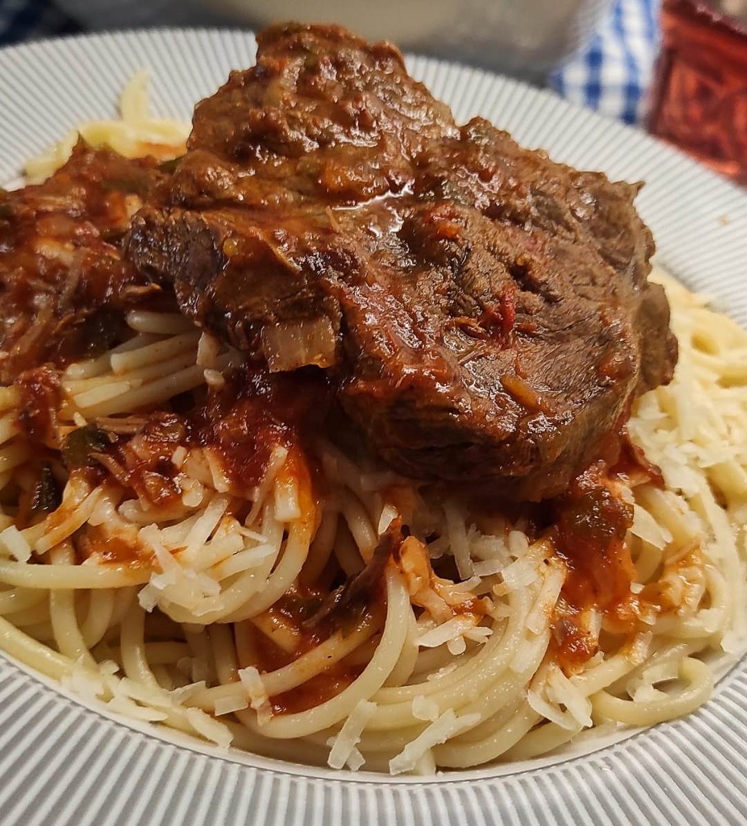 Το Κρέας: Εκτός από χτένι, ιδανικές κοπές για Κοκκινιστό Μοσχάρι με Μακαρόνια είναι το ποντίκι, ο λαιμός ή το στήθος. Όλες χρειάζονται πολύωρο σιγοβράσιμο για να μαλακώσουν.