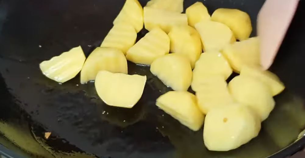 Στη συνέχεια σοτάρουμε το σκόρδο σε ένα τηγάνι και το βγάζουμε σε ένα πιάτο και το αφήνουμε στην άκρη μετά στο ίδιο τηγάνι τηγανίζουμε ελαφρώς τις πατάτες έως ότου να κάνουν μία κρούστα απέξω και τις βάζουμε σε ένα πιατο.