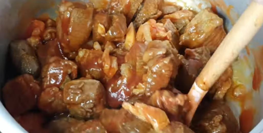 Σε μία χυτρα σοτάρουμε το κρεμμύδι να καραμελώσει ρίχνουμε και το σκόρδο και στη συνέχεια ρίχνουμε στην χλυτρα το κρέας προσθέτουμε τη σάλτσα ντομάτας και όλους τους ζωμους απο την μαρινάδα και τα ανακατεύουμε όλα μαζί προσθέτουμε το νερό και τους δύο κύβους μαγειρεύουμε στη χύτρα για 15 λεπτά μέχρι να μαλακώσει το κρέας.