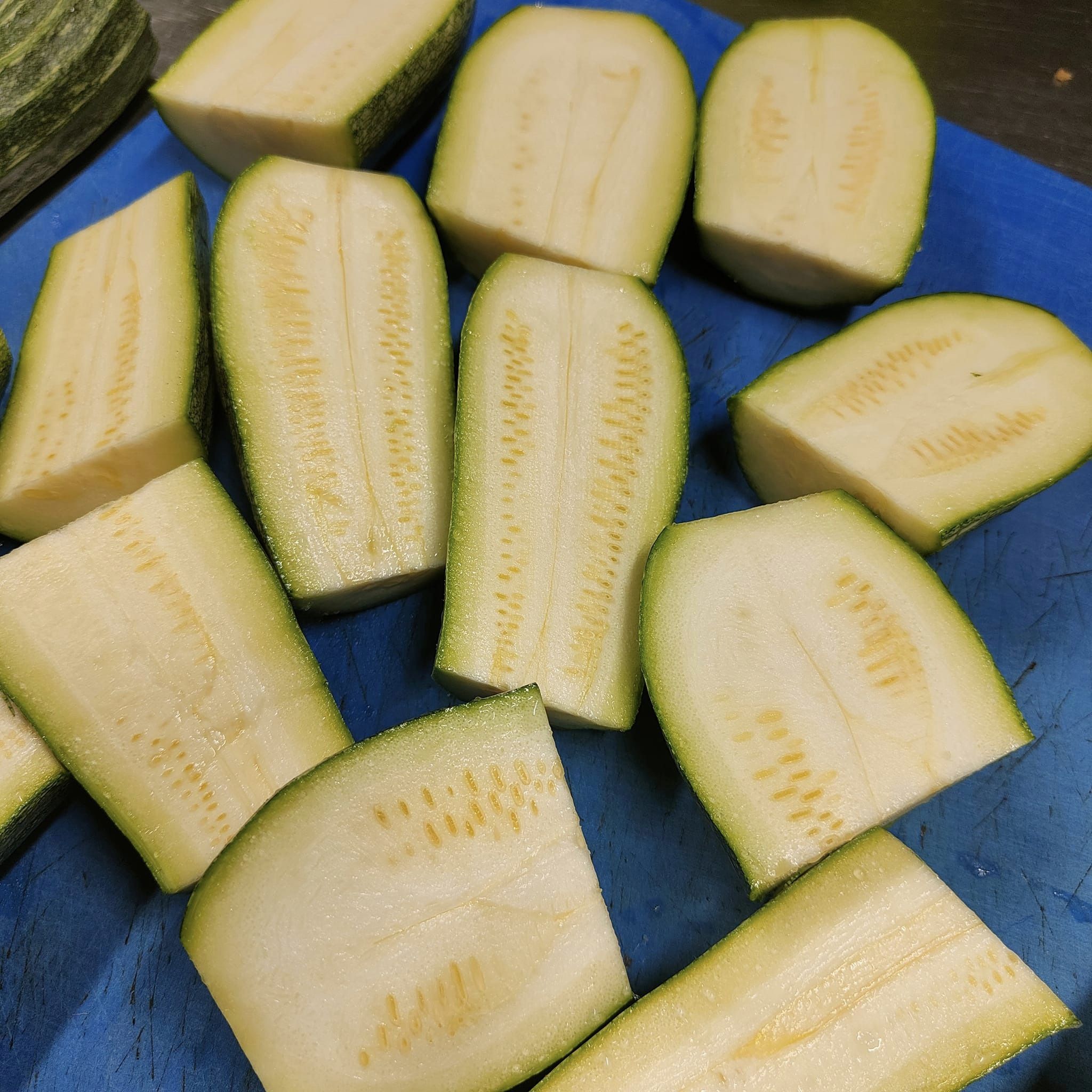 Πλένουμε καλά τα κολοκυθάκια και τα κόβουμε κατά μήκος στη μέση.