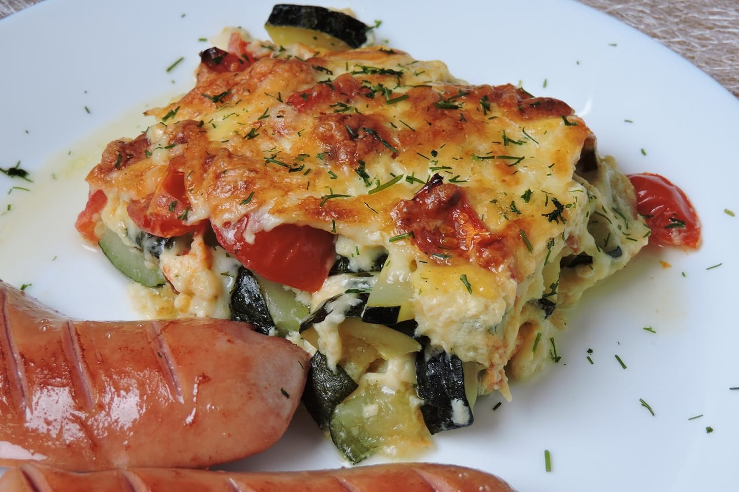 Κόβουμε τα πλυμένα κολοκύθια σε κύβους και τα τηγανίζουμε ελαφρά σε τηγάνι με 3 κουταλιές της σούπας. λάδι. Ρίξτε τα σε ένα κατάλληλο ταψί για το φούρνο. Πασπαλίζουμε με ψιλοκομμένο άνηθο, αλάτι και λίγο τριμμένο τυρί. Τακτοποιήστε τις ψιλοκομμένες ντομάτες από πάνω και πασπαλίζουμε ξανά με κίτρινο τυρί.