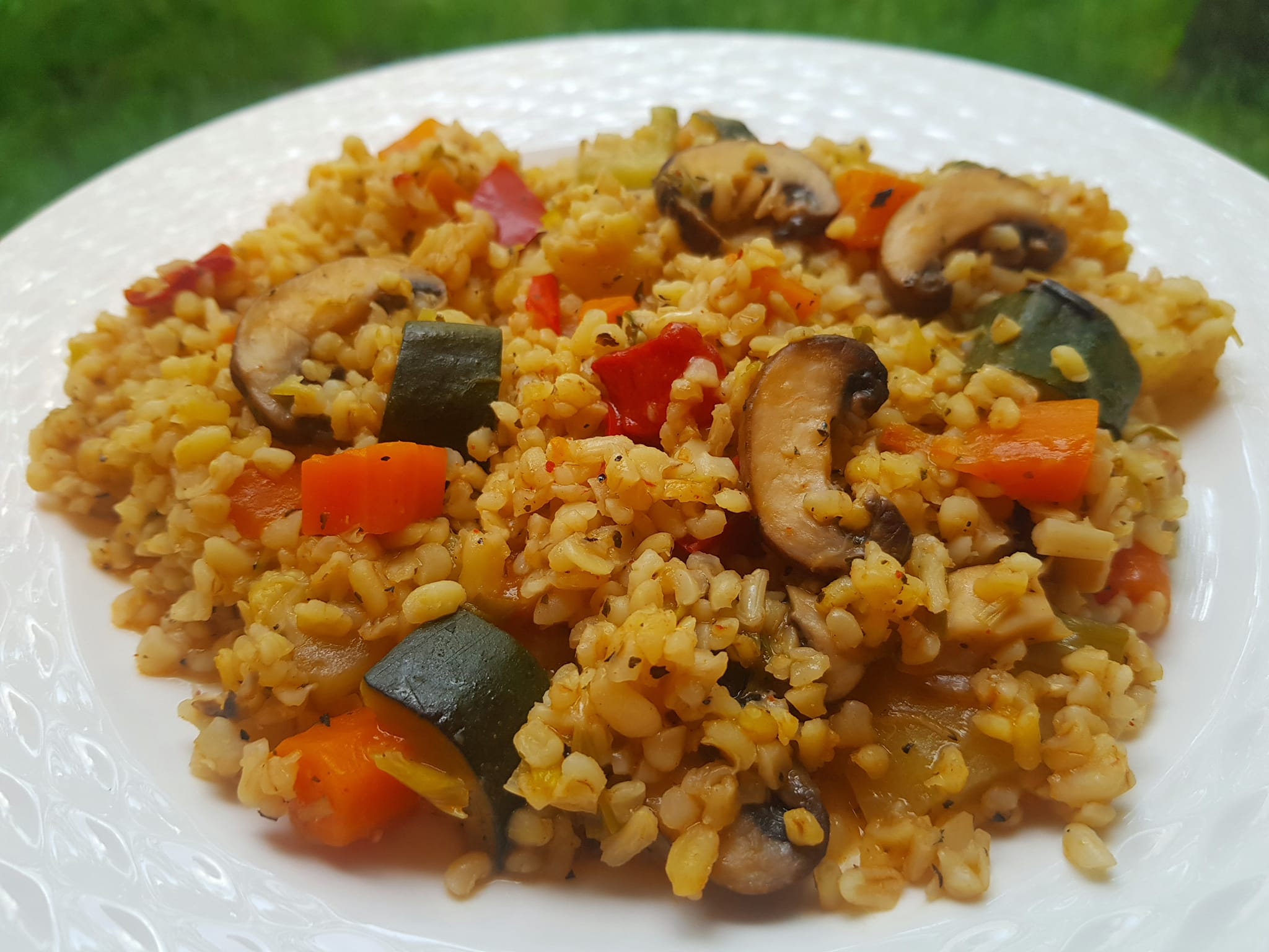Σε βαθύ τηγάνι σωτάρισα ένα καρότο, μια κόκκινη πιπεριά, πρόσθεσα τα μανιτάρια, τα άφησα να σιγοβράσουν, μετα έριξα τα φρεσα κρεμμυδάκια, ​​σκόρδο και τέλος έβαλα τα κολοκυθάκια. Προσθέτω περίπου 150 γρ πλιγούρι θρυμματισμένο, το αφήνω να τσιγαριστεί και βάζω πιπέρι, λίγη παπρικα και ρίχνουμε 400 ml ζωμό (νερό).