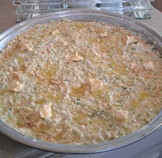 4. Παίρνω ένα ταψί, το αλείφω με Βιτάμ ή βούτυρο και πασπαλίζω με λίγο αλεύρι ή φρυγανιά για να μην κολλήσει η πίτα. απλώνω ομοιόμορφα το μείγμα στο ταψί.