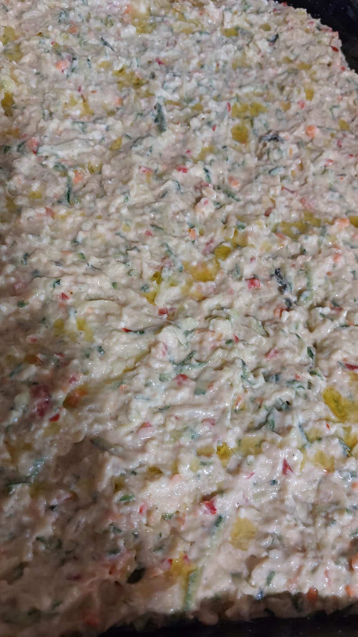 Προσθέτουμε το καρότο Τριμμένο, κόκκινη πιπεριά ή και πράσινη, κρεμμύδια,ανηθο,μαϊντανό, λίγο ελαιόλαδο, φετα,