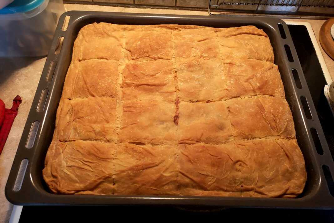 Ψήνω την πίτα σε προθερμασμένο φούρνο στους 180 βαθμούς Κελσίου πάνω-κάτω αντιστάσεις για 1:30 ώρα