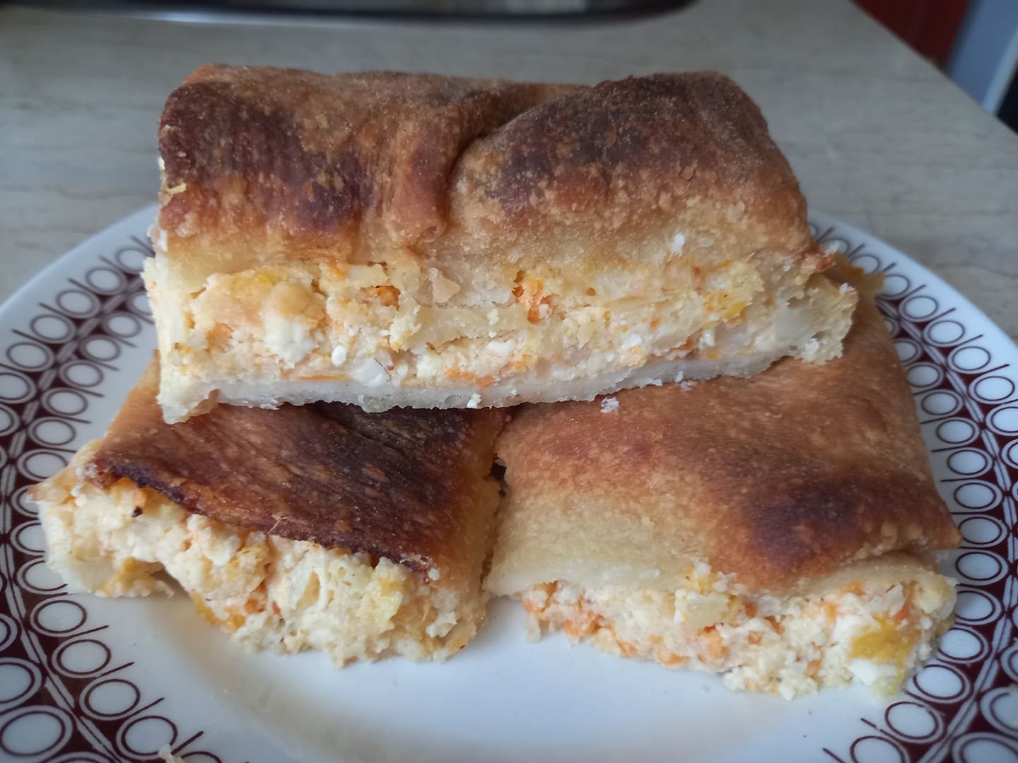 Ρίχνουμε λίγο αλεύρι στον πάγκο της κουζίνας μας και ανοίγουμε δύο φύλλα περίπου στο μέγεθος του ταψιού μας. Λαδώνουμε τον πάτο του ταψιού και τοποθετούμε τα δύο φύλλα αφού τα λαδώσουμε και αυτά ενδιάμεσα. Ρίχνουμε τη γέμιση. Ανοίγουμε τα δύο επόμενα φύλλα και σκεπάζουμε το μείγμα αφού τα λαδώσουμε και αυτά ενδιάμεσα. Ό,τι περισσεύει το βάζουμε μέσα στο ταψί σχηματίζοντας το γνωστό κόθρο. Λαδώνουμε ελαφρώς την επιφάνεια την χαράζουμε σε κομμάτια και την ψεκάζουμε με λίγο νερό έτσι ώστε το φύλλο μας να γίνει τραγανό. Ψήνουμε σε προθερμασμένο φούρνο τις αντιστάσεις στους 180 βαθμούς Κελσίου για μία ώρα περίπου έως ότου ροδίσει!!!