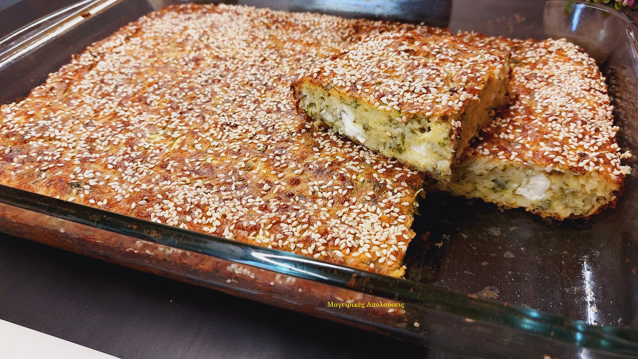 Περνουμε ένα πυρέξ 25 * 35 εκ βάζουμε λίγο ελαιόλαδο στον πάτο ρίχνουμε το μείγμα μας έχουμε ανάψει το φούρνο μας 200 βαθμούς αντιστάσεις απλωνουμε καλά λίγο ελαιόλαδο από πάνω πασπαλίζουμε με σουσάμι και ψήσιμο 200 βαθμούς αντιστάσεις μέχρι να πάρουν ένα ωραίο χρώμα θέλει μία ωρίτσα περίπου