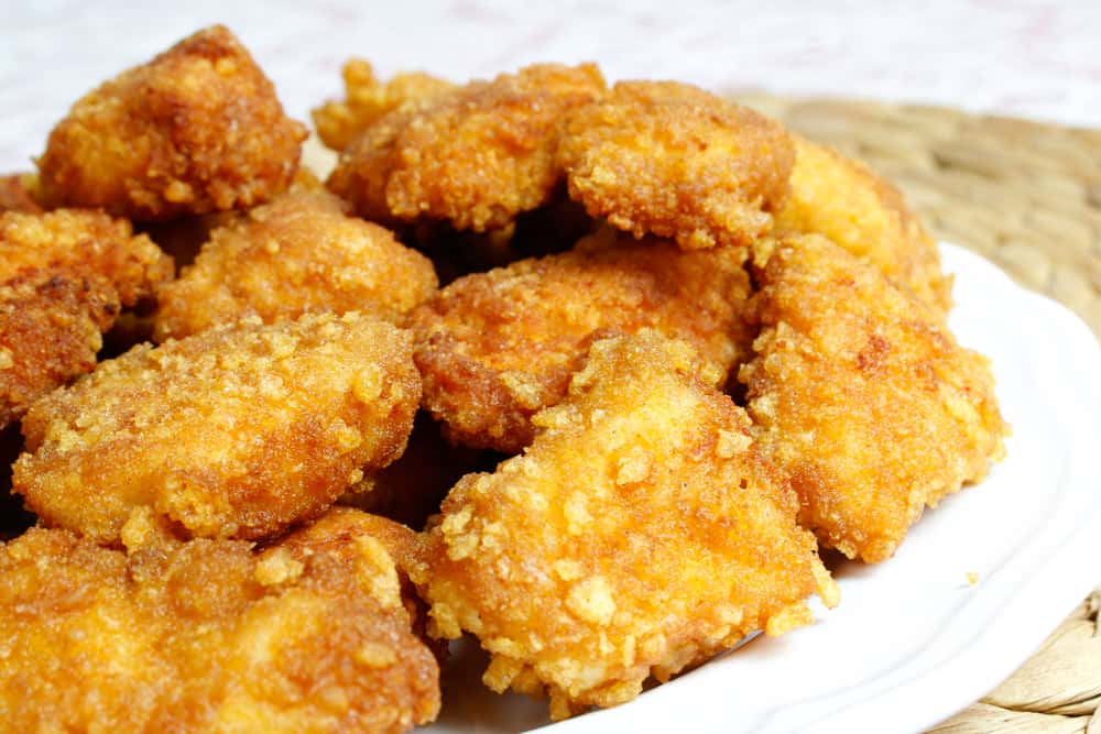 Πάρτε τα κομμάτια κοτόπουλου και βυθίστε τα πρώτα στο μίγμα αλεύρου και κορνφλαουρ. Στη συνέχεια, βυθίστε τα στο αυγό και, τέλος, βυθίστε τα στα τρίμματα nachos και τηγανίστε σε χαμηλή φωτιά. Πρέπει να πάρουν ένα χρυσοκαφέ χρώμα γυρνώντας σε κάθε πλευρά.