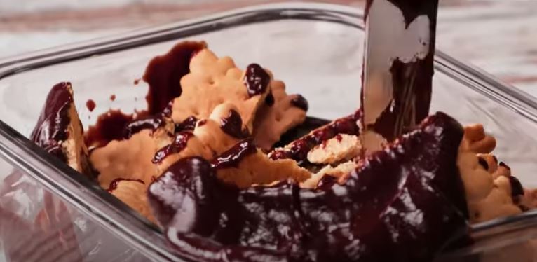 Σε ένα μπολ εχουμε τα μπισκότα και απο πάνω ρίχνομε την σοκολάτα.