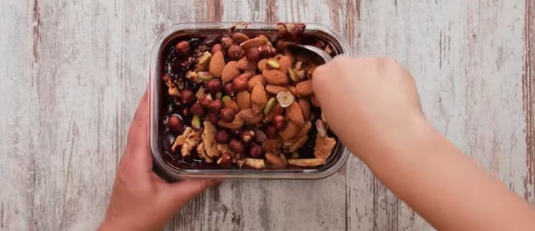 και μετα ρίχνουμε απο πάνω στους ξηρούς καρπούς.