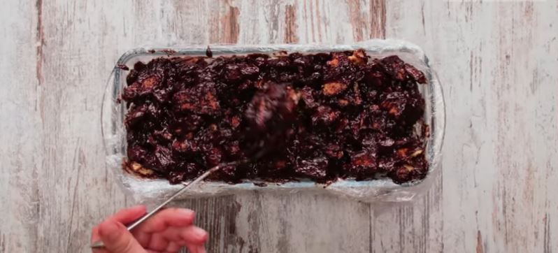 Ετοιμάζουμε μιά φόρμα 18cm x 6cm και την στρώνουμε με μια μεμβράνη που κρέμεται έξω από την φόρμα και αρχίζουμε κουταλιά κουταλιά βάζουμε το μείγμα στην φόρμα και να το ισώνουμε.