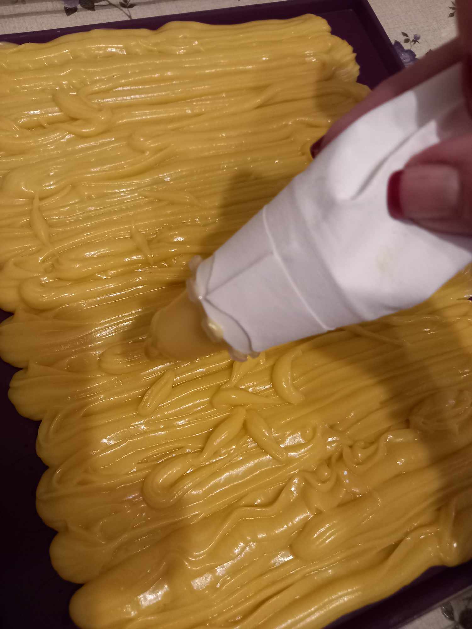 Βάζουμε τη ζύμη σε ένα κορνέ και σχηματίζουμε οριζόντιες γραμμές σε ένα ταψί στρωμένο με λαδόκολλα, ώστε να δημιουργηθεί ένα ενιαίο φύλλο.