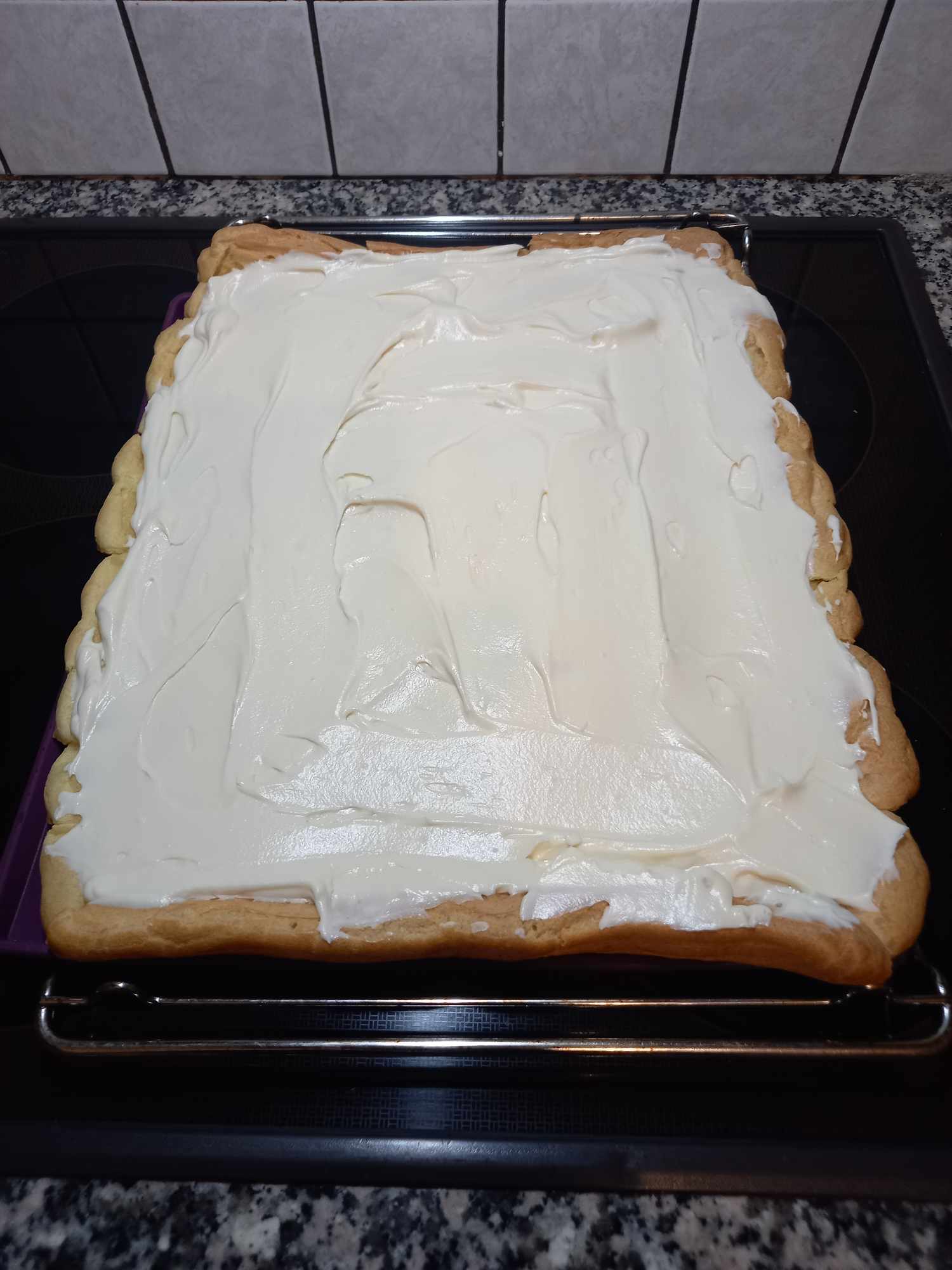Αναποδογυρίζουμε το ψημένο φύλλο ζύμης και απλώνουμε ομοιόμορφα την κρέμα βανίλιας.