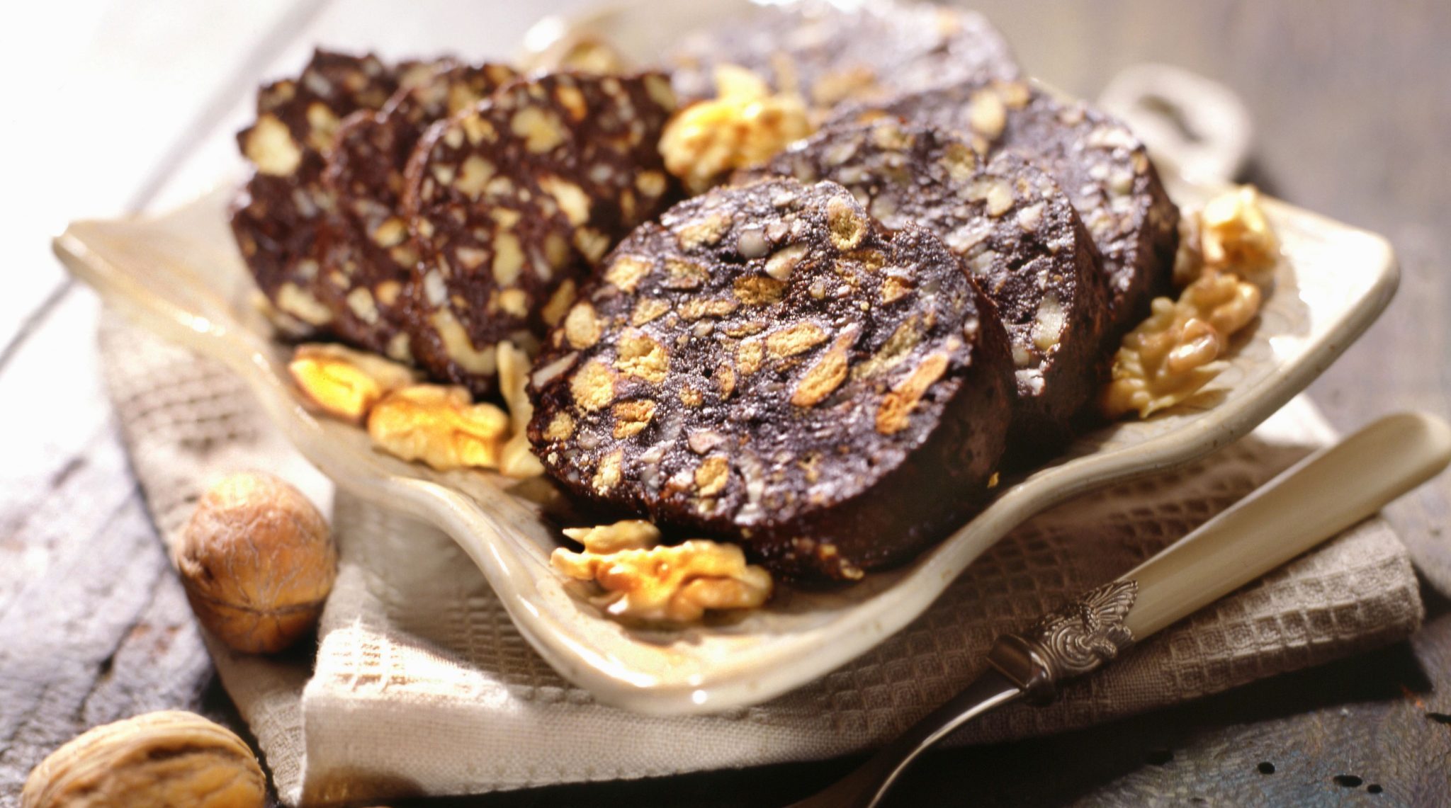 Τυλίγουμε την μεμβράνη καλά σαν καραμέλα, σφίγγοντας τις δύο άκρες και διορθώνουμε όποια ατέλεια στο σχήμα. Τοποθετούμε στο ψυγείο για μία νύχτα για να σφίξει καλά ο κορμός. Αφαιρούμε την μεμβράνη, κόβουμε σε κομμάτια και σερβίρουμε με άχνη ζάχαρη ή κακάο σε σκόνη.