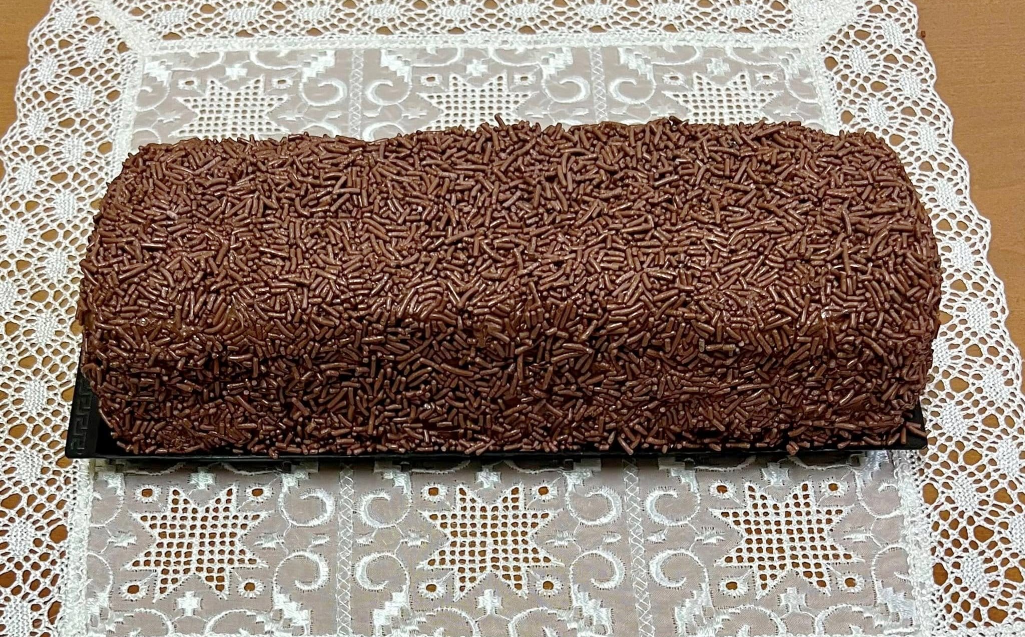 Ένας λαχταριστός κορμός σοκολάτας πασπαλισμένος με τρούφα και νουτέλα, κομμένος σε φέτες που δείχνουν τα λευκά κομμάτια μπισκότου στο εσωτερικό του.