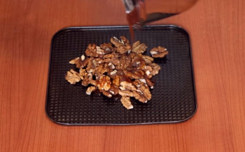 Λιώστε τη ζάχαρη σε καραμέλας και στη συνέχεια ρίξτε την πάνω στα καρύδια και αφήστε να κρυώσει.