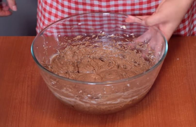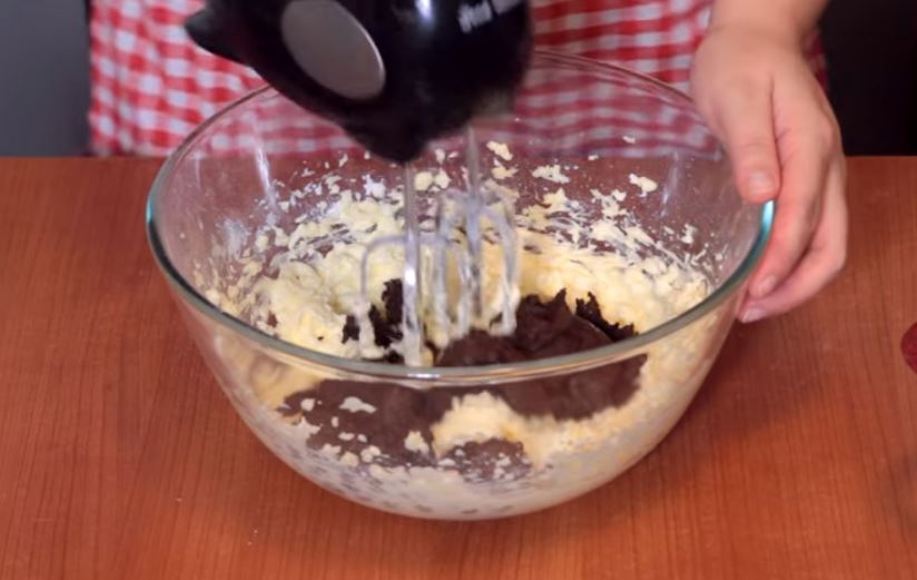 Χτυπήστε το βούτυρο και τη ζάχαρη άχνη έως ότου είναι αφρώδες, στη συνέχεια προσθέστε την κρυα σοκολατένια κρέμα αυγού και χτυπήστε ελαφρά.