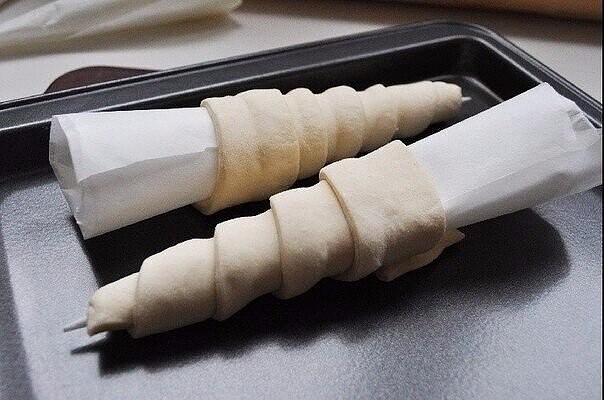 4. Τυλίξτε κάθε λωρίδα γύρω από το χωνί, ξεκινώντας από το στενό άκρο του σωλήνα (οι λωρίδες πρέπει να επικαλύπτονται μεταξύ τους). Βάλτε σε ένα ταψί.
