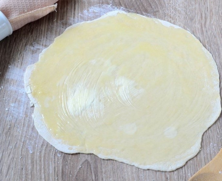 7. Λιπάνετε τον πρώτο φύλλο με λιωμένο βούτυρο, είναι πολύ βολικό να το κάνετε αυτό με μια μαγειρική βούρτσα. Απλώστε απο πάνω μια δεύτερη στρώση ζύμης και αλείψτε ξανά με βουτυρο.