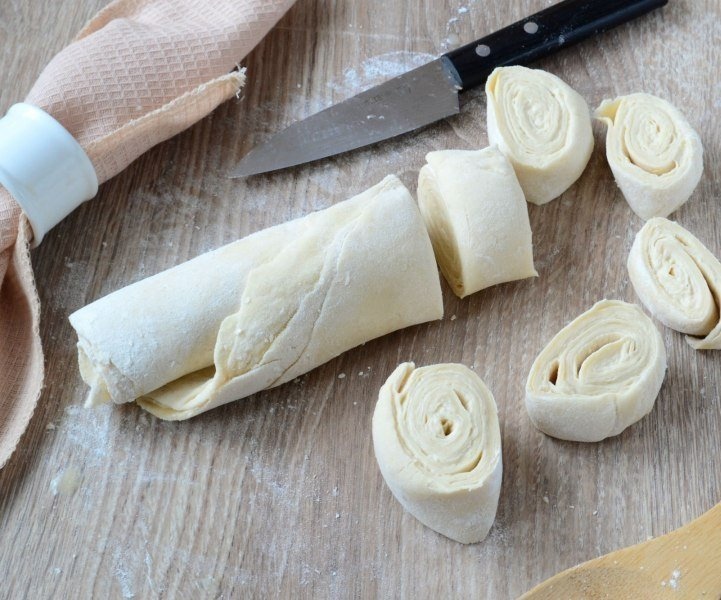 9. Τυλίξτε το στρώμα που προκύπτει σε ένα σφιχτό ρολό και κόψτε το σε κομμάτια πλάτους 3–4 cm.